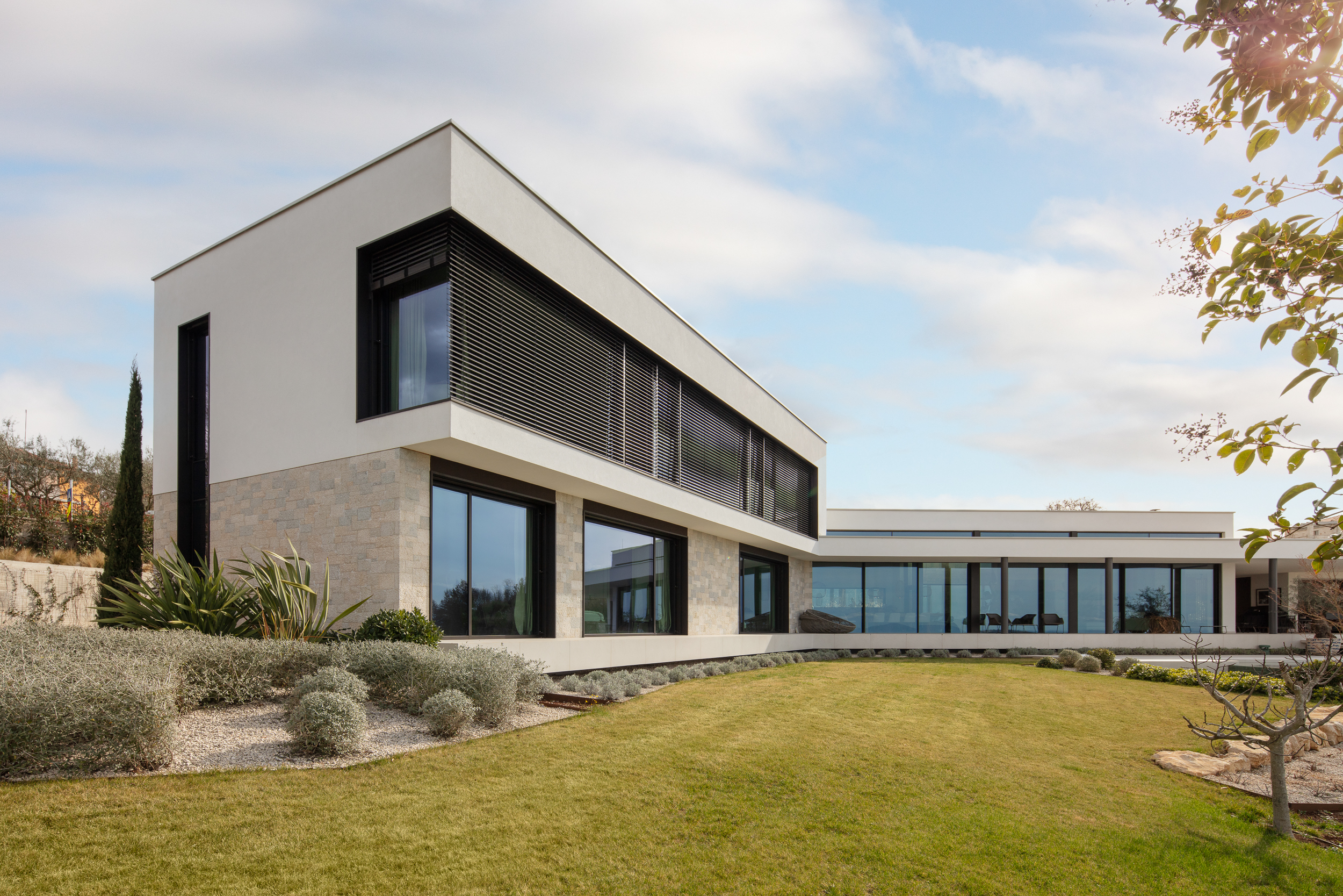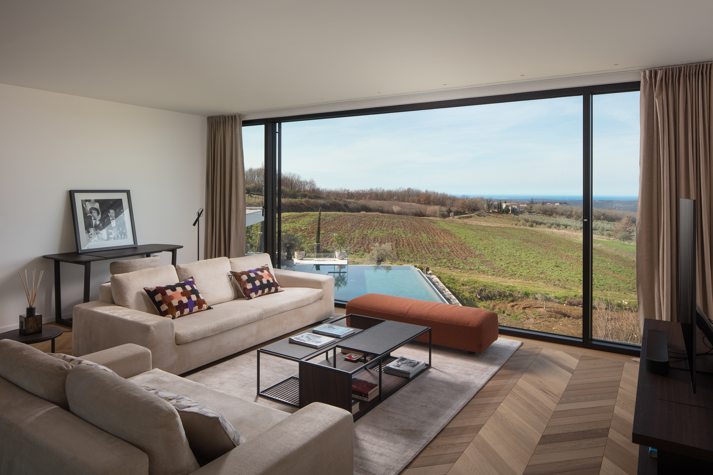 Punih zidova prema prilazu ,a potpuno otvorena,odvojena samo staklom od vinograda i mediteranskog pejzaža.