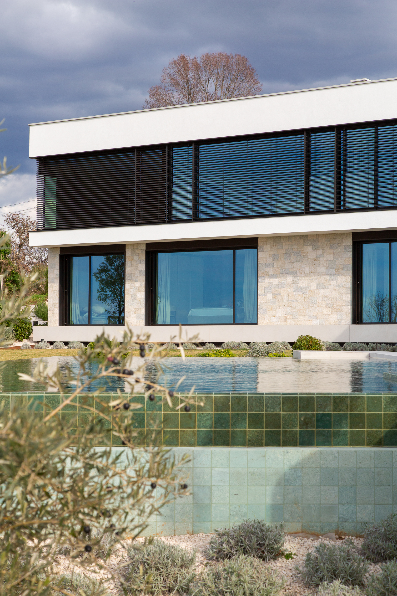 Klasična prostorna organizacija u kojoj su dnevni prostori u prizemlju,a sobe i biblioteka na katu,nadopunjena je dnevnim boravkom kuhinjom i blagovaonom u natkrivenom vanjskom prostoru,uz deniveliranu terasu bazena.