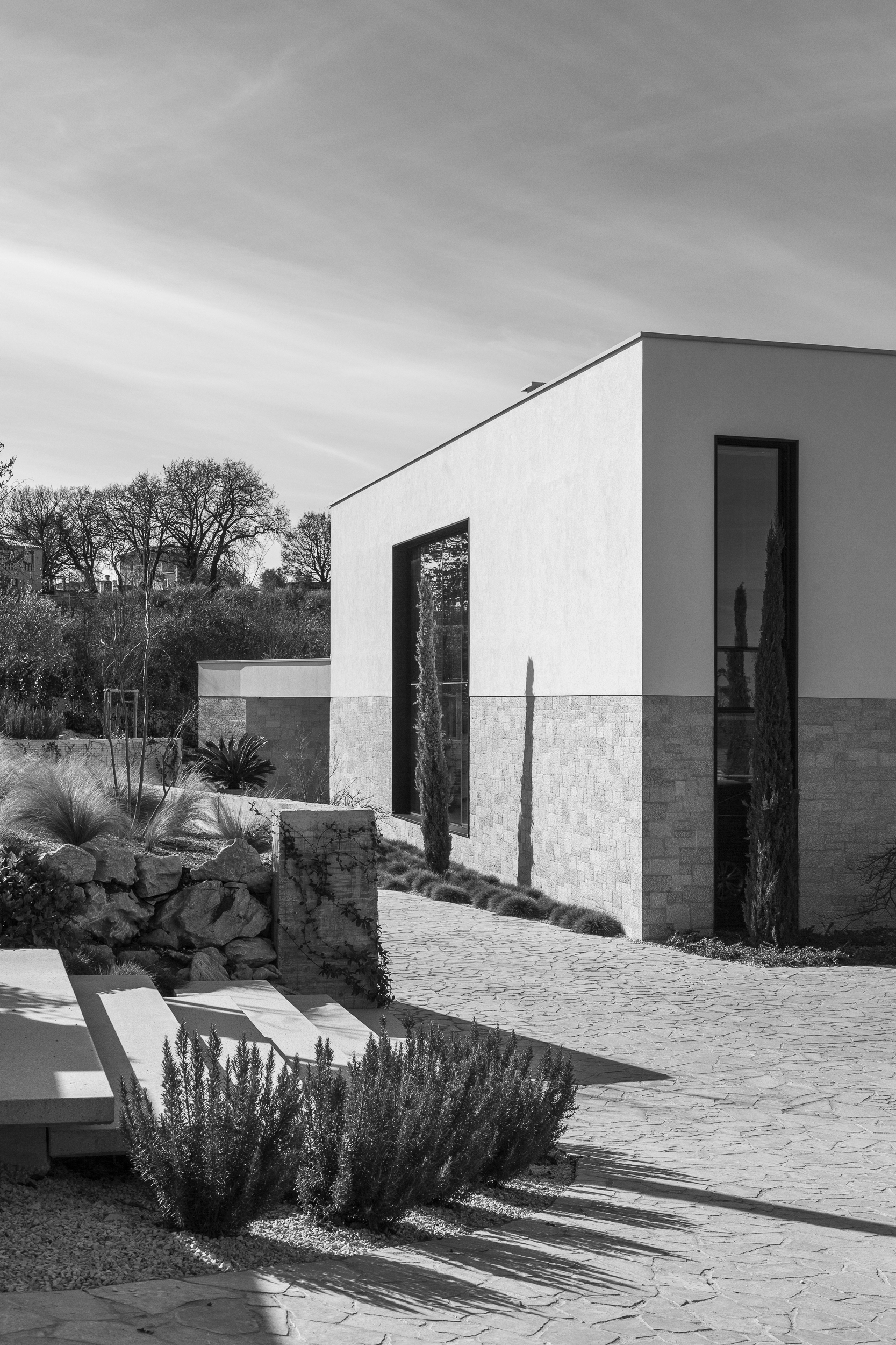 U vanjskim prostorima ,terasama i vrtu,prekrivenim mediteranskim biljem i kamenim popločenjem , reflektiraju se elementi krajolika.