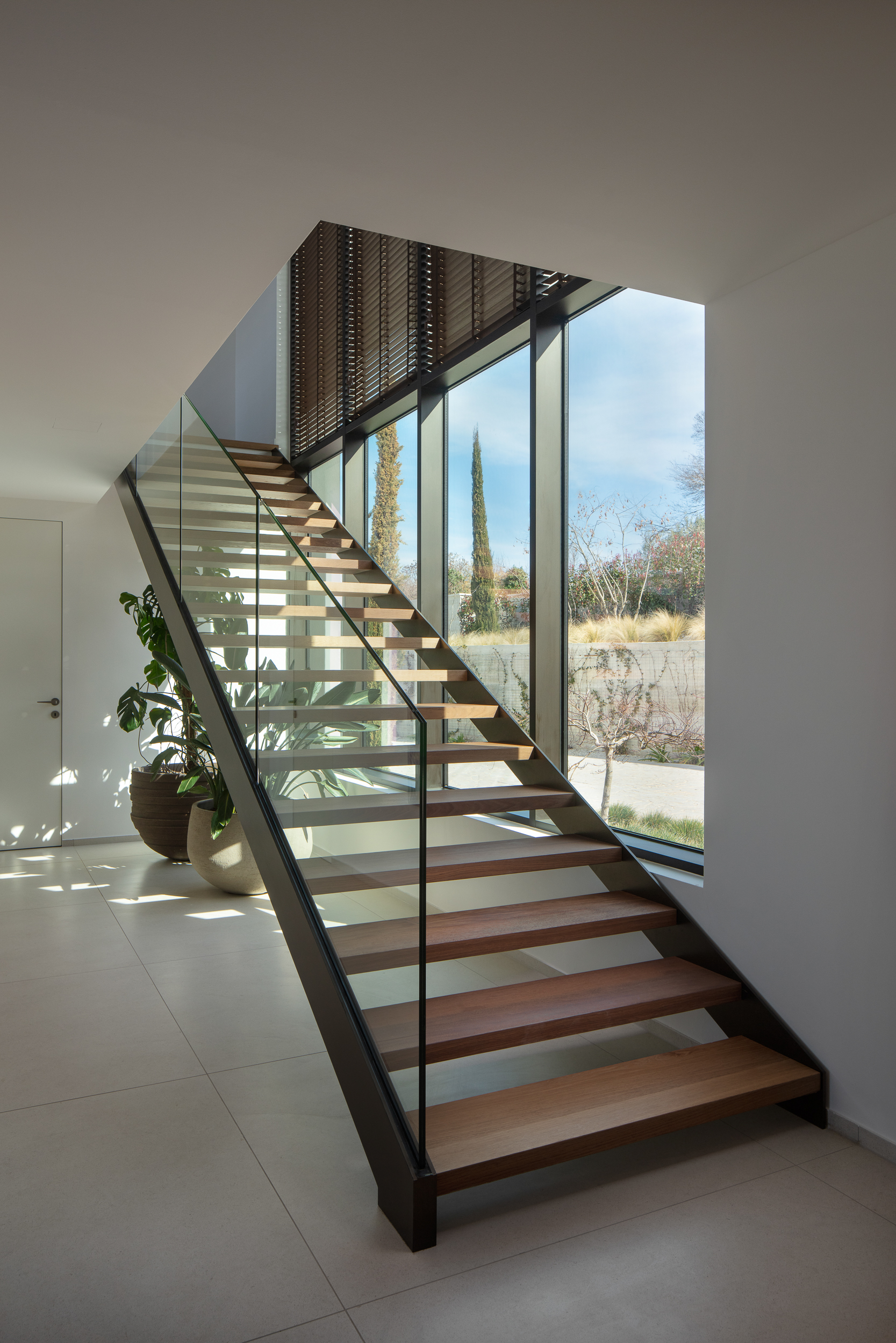 Unutarnji prostori su s jedne strane potpuno otvoreni prema pejzažu ,a prema putu su potpuno zatvoreni punim zidom koji je prorezan staklenom stijenom na jednom kraju,a dodanim unutarnjim atrijem na drugom.